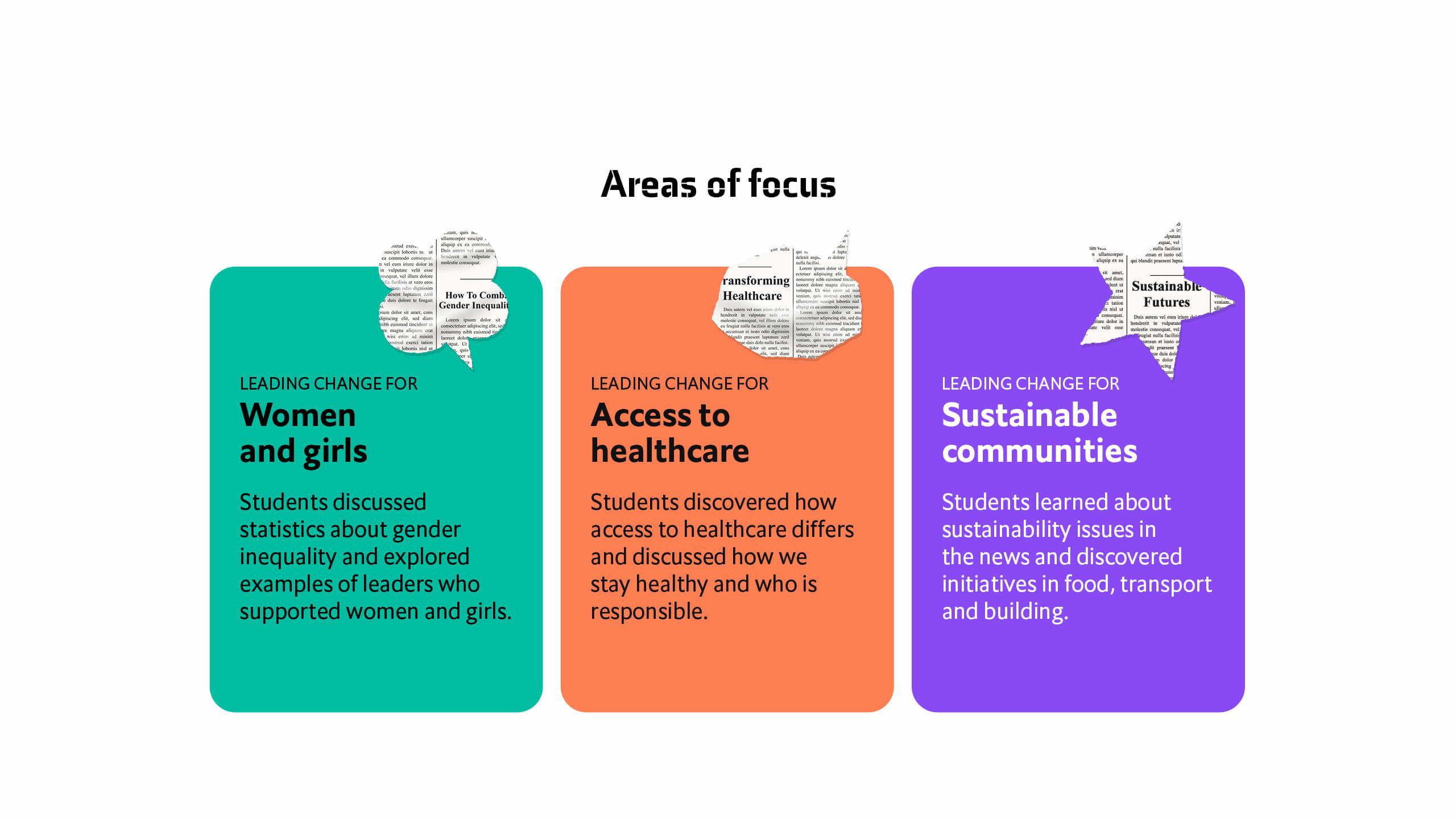 Following a series of classroom lessons, the Leadership for Change Prize offered students the chance to submit their “Project for Change” as part of a global competition. Three winning entries were selected by a panel of judges and each winner received funding and mentorship to turn their projects into reality.